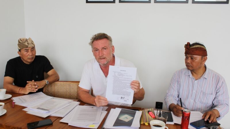 After Petroulas began constructing an access road over the irrigation system without coordinating with local authorities, the Subak demanded a standard contribution of 10 million rupiah (approximately US$600). Instead of complying and engaging in respectful dialogue, Petroulas accused the Subak of “harassment” and personally insulted community leaders. “He then used this false story as an excuse to intimidate the current land tenant and attempt to extort compensation of 2 billion rupiah (approximately US$125,000) from the elderly man—200 times the reasonable donation requested by the Subak,” Phillippe explained to the media, accompanied by his attorney, I Nyoman Wirajaya, S.H., M.H., on Monday, October 27, 2025, in Canggu, Bali.