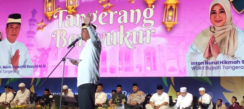 Dalam sambutannya, Bupati Tangerang Moch. Maesyal Rasyid mengajak seluruh masyarakat menundukkan kepala, menengadahkan tangan, dan membuka hati untuk bersyukur atas rahmat dan kemajuan yang telah diraih bersama.