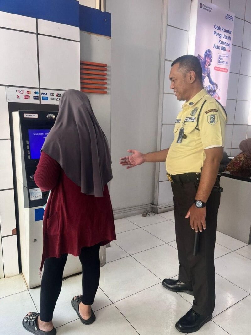 Kelapa Dua Tangerang, Suararealitas.co– Security BRI Unit Kelapa Dua memberikan pendampingan kepada nasabah dalam melakukan transaksi tarik tunai di ATM tanpa menggunakan kartu, memanfaatkan aplikasi BRImo.
