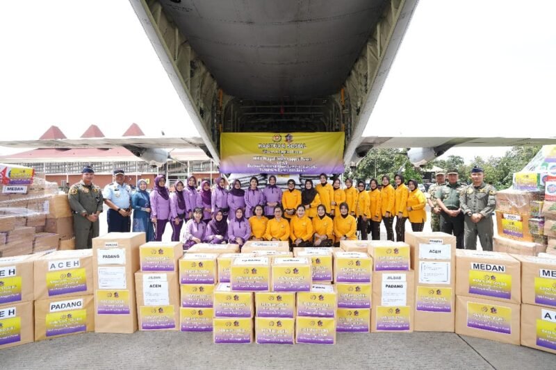 Tanggerang, Suararealitas.co – (Puspen TNI). Ketua Umum Dharma Pertiwi sekaligus Ketua Umum IKKT Pragati Wira Anggini Ny. Evi Agus Subiyanto didampingi oleh Ketua Harian Dharma Pertiwi Ny. Susi Tandyo Budi R dan Ketua Harian IKKT PWA Ny. Selly Richard Tampubolon beserta pengurus pusat menyerahkan bantuan untuk didistribusikan kepada masyarakat terdampak bencana di Sumatera, Halim Perdanakusuma, Senin (8/12/2025).