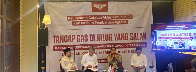 Peluncuran laporan tahunan yang digelar di Jakarta, Kamis, 15 Januari 2026, mengangkat tema “Tancap Gas di Jalur yang Salah” dan dipresentasikan oleh Sekretaris Jenderal KPA, Dewi Kartika. Melalui catatan ini, KPA merangkum dinamika agraria sepanjang 2025, sejak pelantikan pemerintahan baru pada Oktober 2024 hingga penutupan tahun, termasuk evaluasi atas Asta Cita dan arah politik pembangunan nasional.