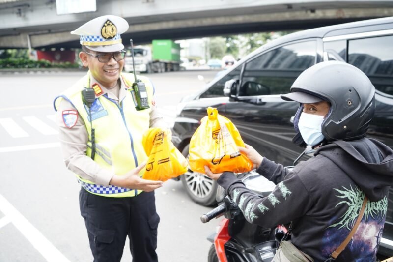 Di tengah padatnya arus kendaraan menjelang waktu berbuka puasa, personel Satuan Lalu Lintas Polres Metro Jakarta Barat bersama komunitas motor gede (moge) Brotherhood Birkers Community turun langsung ke jalan membagikan ribuan paket takjil kepada para pengendara yang melintas.