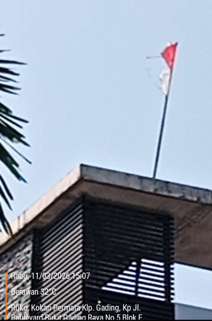 Jakarta Utara, Suararealitas.Co – 27 Maret 2026 – Kondisi bendera Republik Indonesia yang tergantung di atas gedung Hotel King Cross, berlokasi di Komplek Kokan Permata Kelapa Gading, Jl. BoulevardBukit Gading Raya No.42 Blok E38, RT.15/RW.3, Kelapa Gading Barat, Kecamatan Kelapa Gading, Jakarta Utara, Jum”at (27/3/2026) tetap dalam keadaan sobek dan berkibar hingga hari ini, meskipun telah tercatat sejak tanggal 11 Maret 2026.